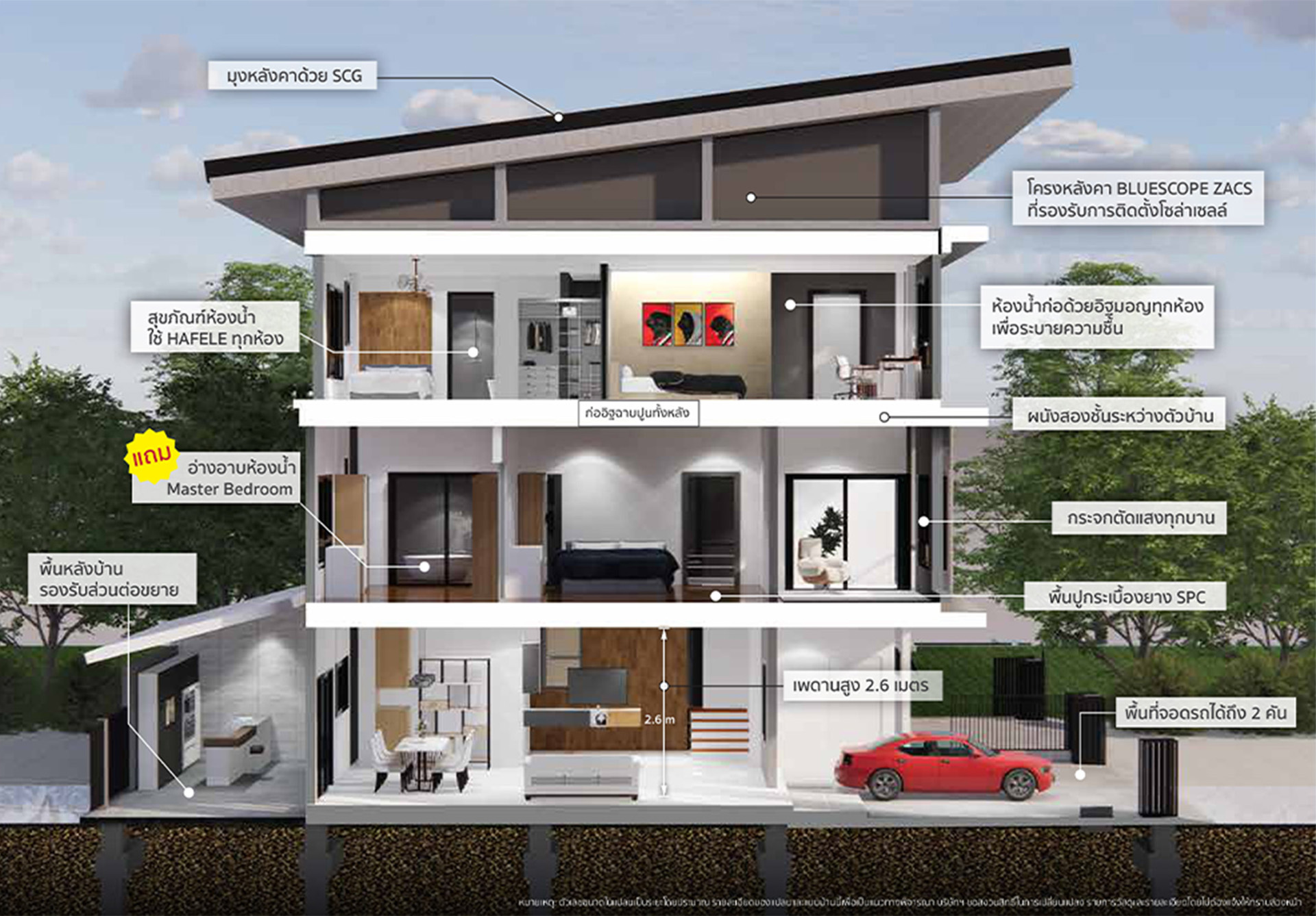 ให้ วัสดุคุณภาพจากแบรนด์ชั้นนำ โครงสร้างหลังคา Blue scope ออกแบบมาเพื่อรองรับระบบโซล่าเซลล์ กระเบื้องหลังคาใช้วัสดุจาก SCG สุขภัณฑ์ Hafele ทั้งหลัง ถังบำบัดและถังเก็บน้ำ Dos มีที่สำหรับ Walk in closet และ Master bedroom พร้อมอ่างอาบน้ำ